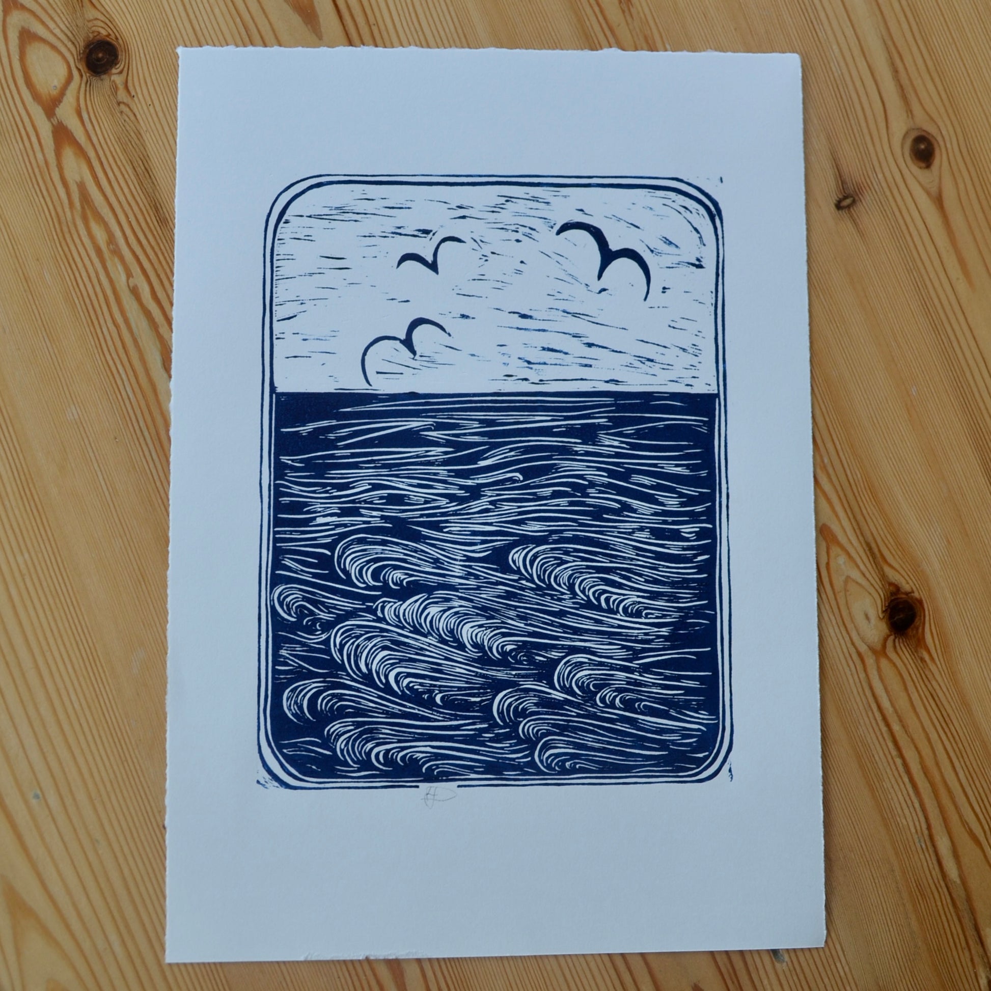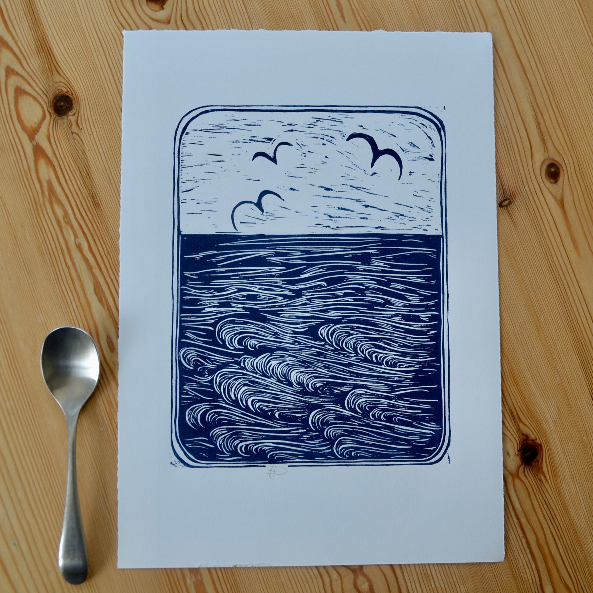 I came home and carved this lino, last year while trading in the beautiful Harbourside town of Porthleven, with the tide metres from my stall.